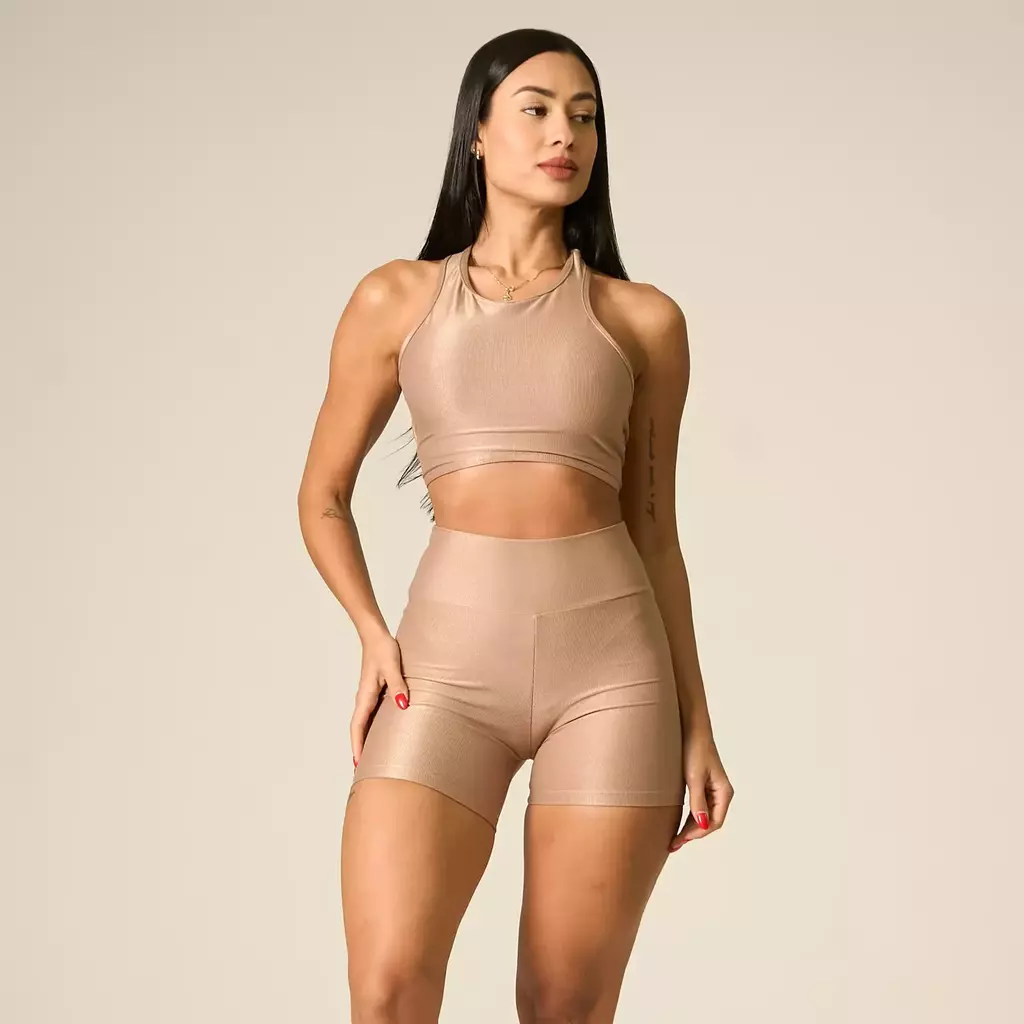 Esse conjunto é produzido com aveludado de compressão (também conhecido como canelado de compressão ou micro-canelado) e tem gramatura de 280g/m². Este tecido tem 85% de poliamida e 15% de elastano. O aveludado de compressão é um tecido altamente elástico e respirável, e conta até mesmo com proteção UV+, garantindo conforto para fazer as atividades físicas. O fator de compressão faz com que o tecido se ajuste bem ao corpo e disfarce celulites e imperfeições.