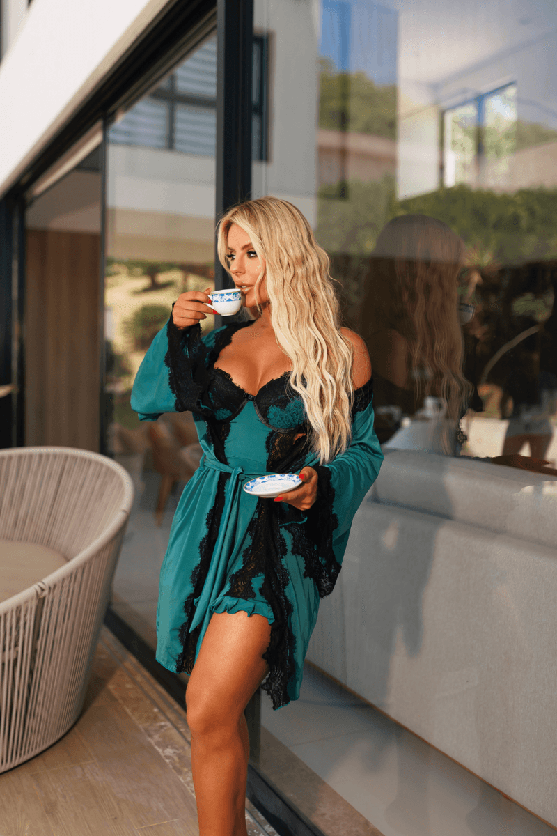 1 Camisola Segredo Lacrado em tecido liganete e renda, com aro e com bojo, aberta atrás e com regulagem nas alças, calcinha semifio com regulagem nas laterais.