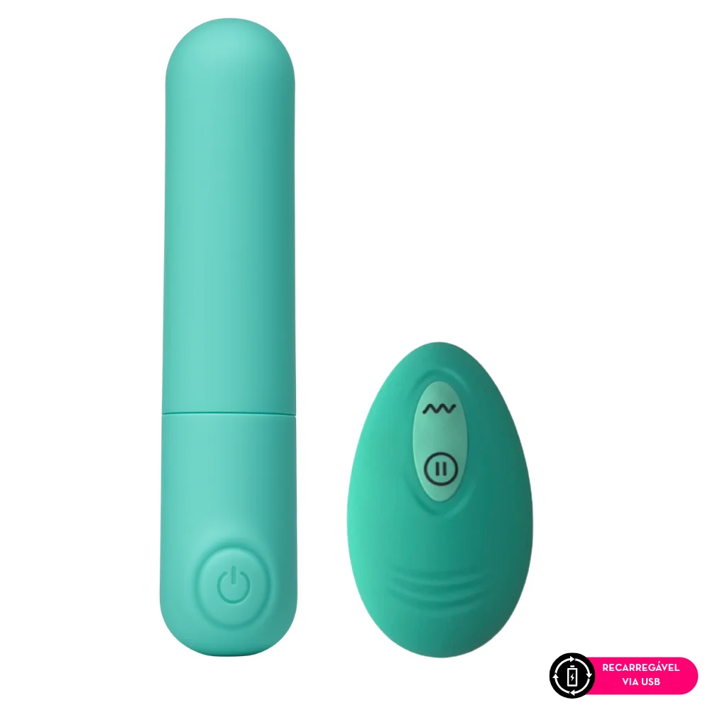 Cápsula vibratória compacta e potente, ideal para estimulação externa. Possui acabamento suave em silicone, controle remoto sem fio e design discreto para uso prático e confortável.